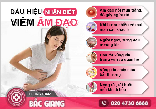 Viêm nhiễm vùng âm đạo: Thường do nấm hoặc vi khuẩn gây nên. Dấu hiệu biểu hiện là vùng kín bị sưng, nóng rát, khí hư tỏa ra một mùi hôi gây ngứa ngáy vùng âm đạo.